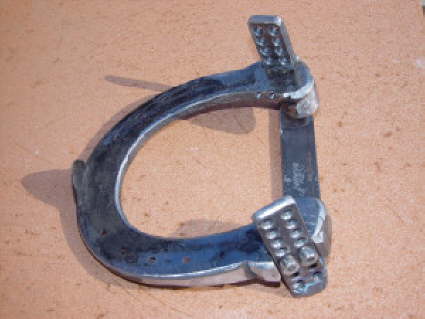 Verstellbares Bügeleisen mit ungekürzten Stützen vor dem Beschlag. Solche Eisen werden verwendet zur Therapie von Verletzungen der tiefen Beugesehne.