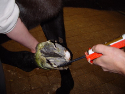 Aufbringen von Dichtmaterial auf Tragrand und in die Strahlfurche zur absuluten Abdichtung. (Vettec Equibuild)