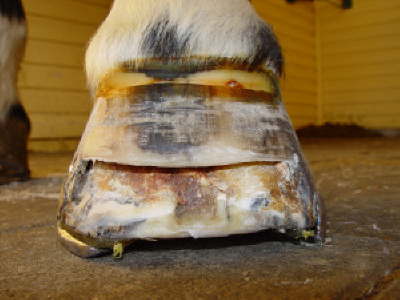 Blick von vorne, die Zehe schwebt durch das vorne offene Eisen.