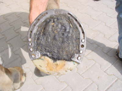 Umgekehrtes Eisen zur Entlastung der Zehe bzw der Hufbeinspitze  (Hufbeinrotation!) und Auffüllung der Sohle mit tragfähigem Polstermaterial zur Entlastung der Wand