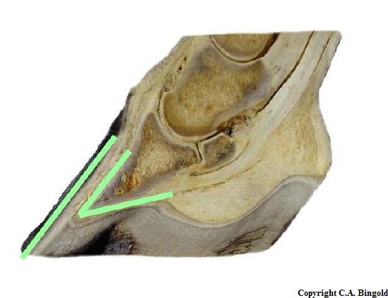 In diesem Fall ist die Rotation nicht so dramatisch, aber auch hier drückt die rotierende Hufbeinspitze auf die Sohle. Außer der reinen Hufbeinrotation gibt es noch andere Varianten der Zerstörung des Hufbeinträgers bzw. der Hufrehe. Neben der Hufbeinrotation kommt es bei der Hufrehe häufig auch zu einer Hufbeinsenkung oder einer Kombination beider Veränderungen. Nicht alle Erkrankungen des Hufbeinträgers werden jedoch durch Hufrehe hervorgerufen, wie auf den nächsten Seiten demonstriert wird. Wie bereits beschrieben wird das Hufbein durch eine Konstruktion in der Hornkapsel gehalten, die in ihrer Funktion einem Klettverschluss ähnelt. |